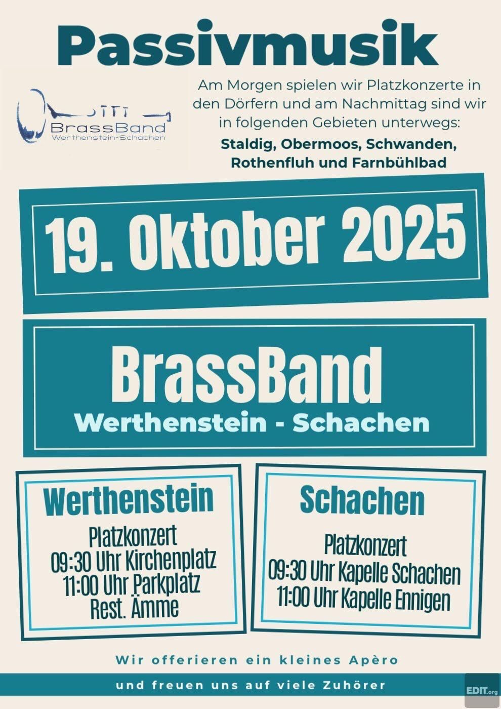 Am Morgen spielen wir Platzkonzerten in den Dörfern und am Nachmittag sind wir in folgenden Gebieten unterwegs: Staldig, Obermoos, Schwanden, Rothenfluh und Farnbühlbad.